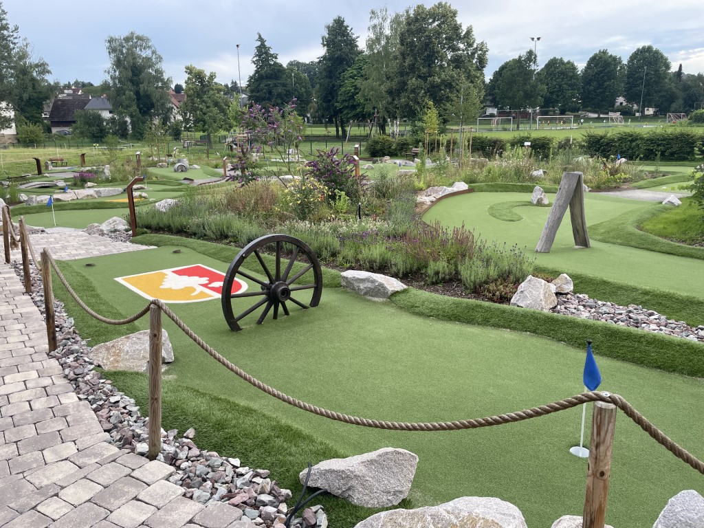 18 Minigolf-Bahnen, die auf Naturboden angelegt sind, mit natürlichen Materialien gestaltet und einem Bachlauf, wobei jede Bahn einen Ortsteil von Bretzfeld widerspiegelt.