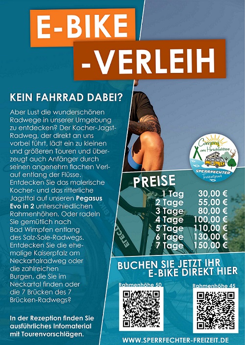 Kein Fahrrad dabei? Aber Lust die wunderschönen Radwege in unserer Umgebung zu entdecken? Der Kocher-Jagst-Radweg, der direkt an uns vorbei führt, lädt ein zu kleinen und größeren Touren und überzeugt auch Anfänger durch seinen angenehm flachen Verlauf entlang der Flüsse. Entdecken Sie das malerische Kocher- und das ritterliche Jagsttal auf unseren Pegasus Evo in 2 unterschiedlichen Rahmenhöhen. Oder radeln Sie gemütlich nach Bad Wimpfen entlang des Salz-Sole-Radwegs. Entdecken Sie die ehemalige Kaiserpfalz am Neckartalradweg oder die zahlreichen Burgen, die Sie im Neckartal finden oder die 7 Brücken des 7 Brücken-Radwegs?